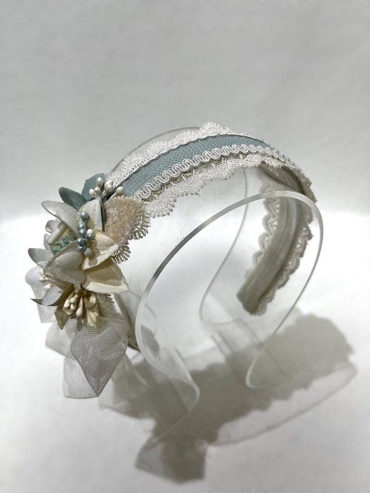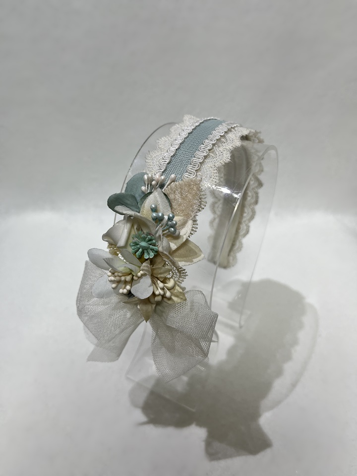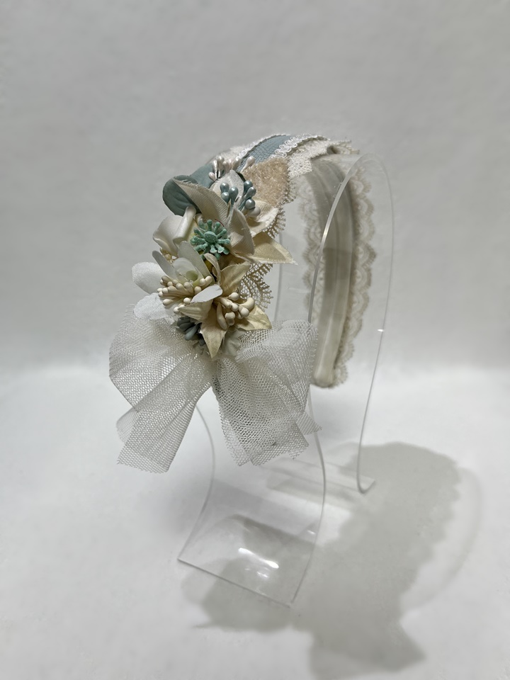 - Material: Tul, pasamanería, flores de distintas texturas en tonos verde agua y beige. En caso de tener algún tipo de alergia, se pueden modificar los materiales afectados por otros, sin variar el precio del producto.