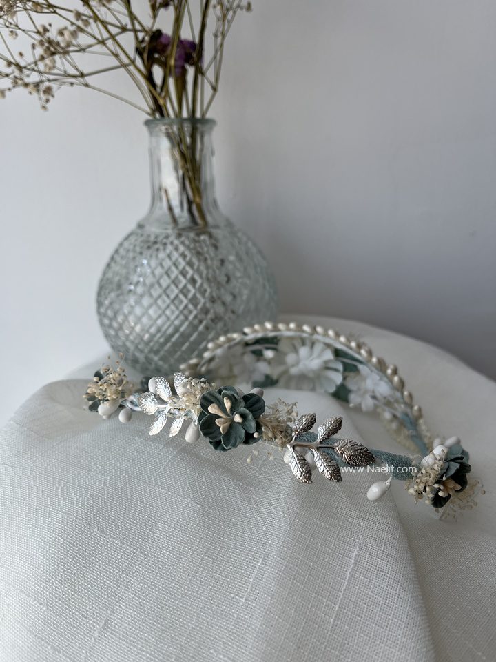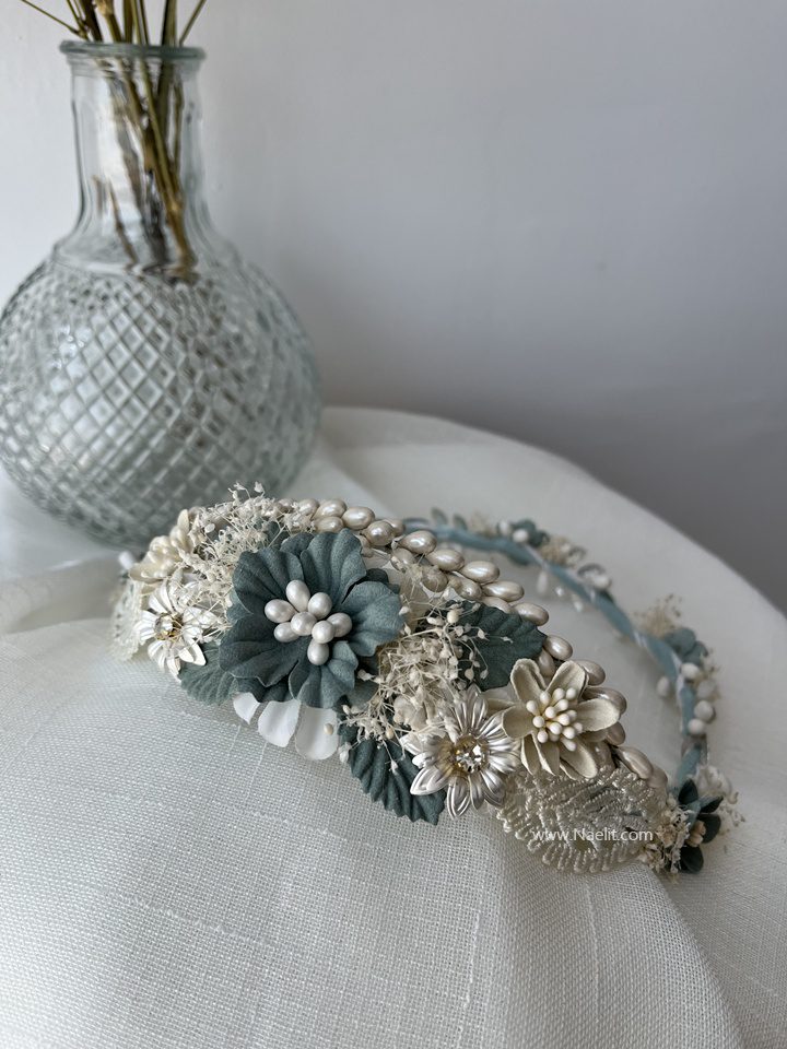 Corona de comunión en tonos verde agua con detalles en plateado. Un diseño romántico ideal para un look delicado y especial.