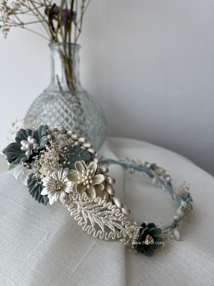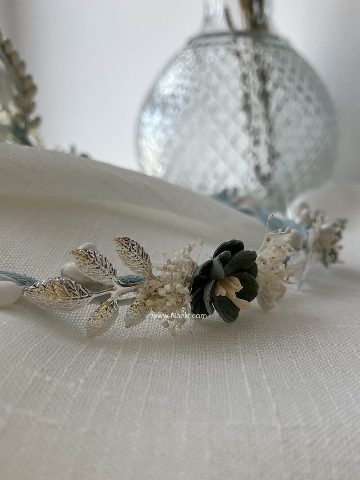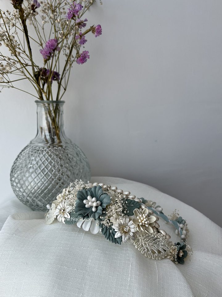 Está compuesta por flores en tonos verde agua, beige y blanco, combinadas con paniculata mini, flores de porcelana y detalle de hojas en tela, creando un conjunto armonioso ideal para looks de comunión delicados y actuales.