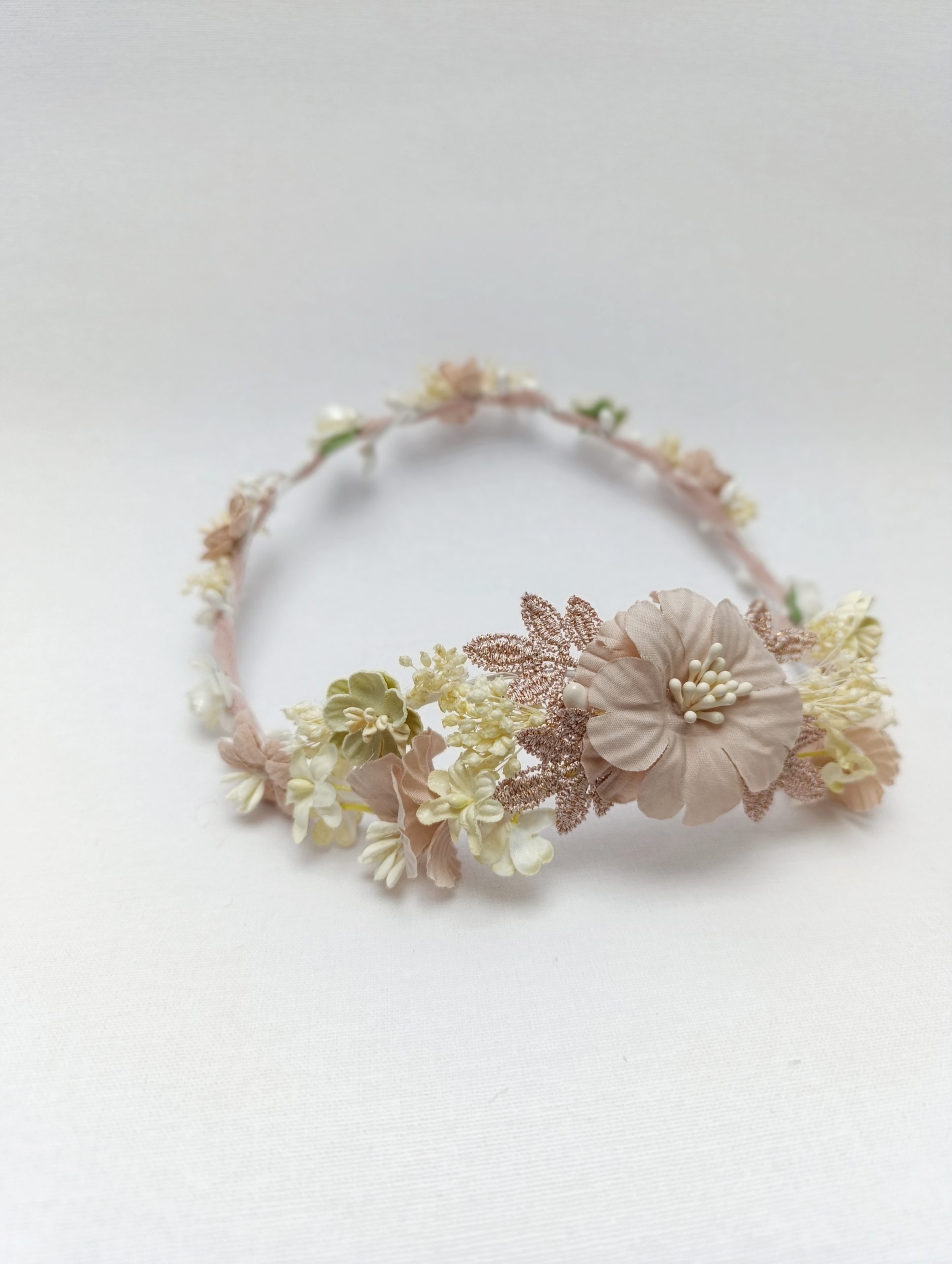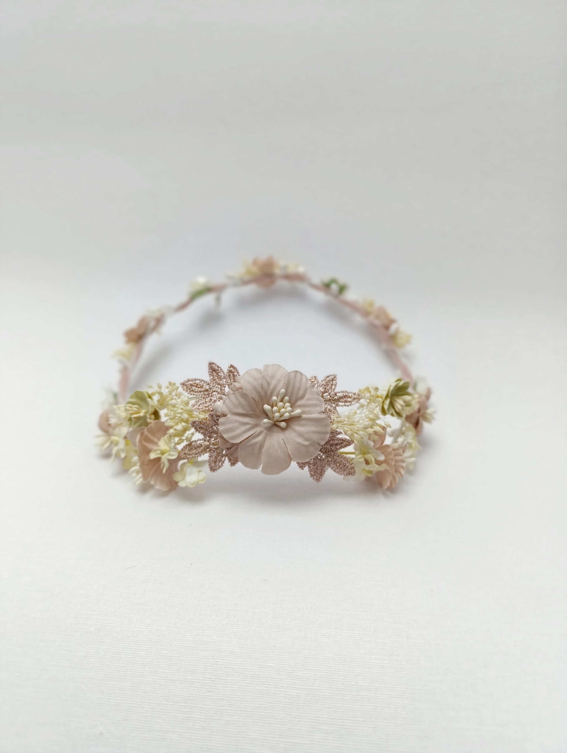Corona de comunión modelo Atlanta concretamente contiene flores con tonos beige, rosa maquillaje y rosa empolvado. Formada su parte posterior por una flor principal en tono rosa, rodeada de elegantes hojas igualmente rosas pero con un leve toque brillante, siguiendo la composición de paniculata y otras flores más pequeñas beige y rosa. La parte frontal en cambio, es una estructura sencilla formada por una fila de flores beige y rosa.