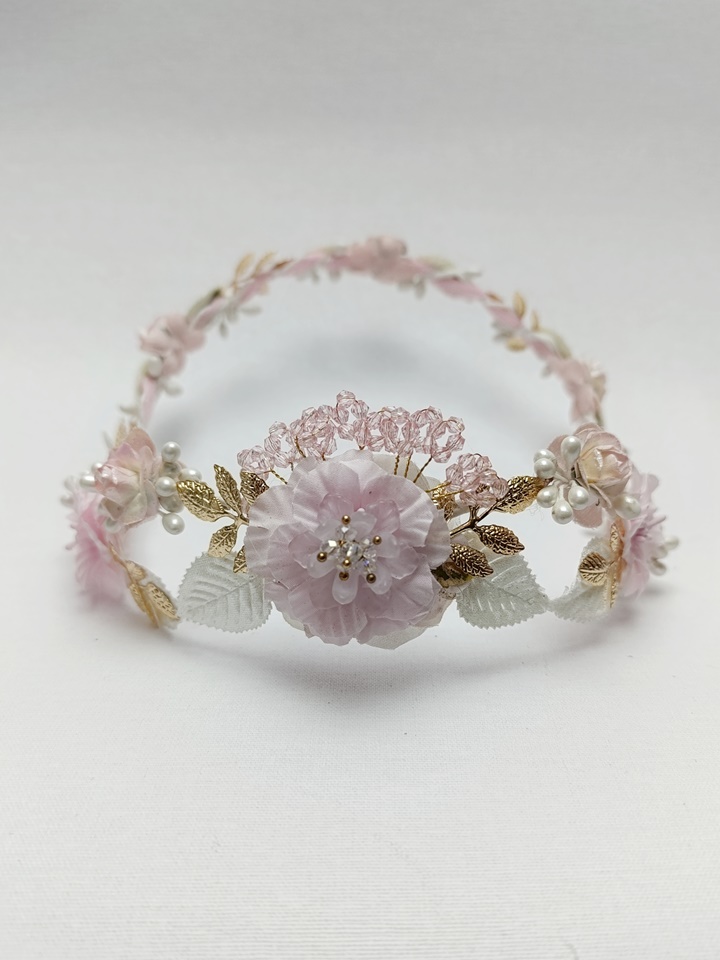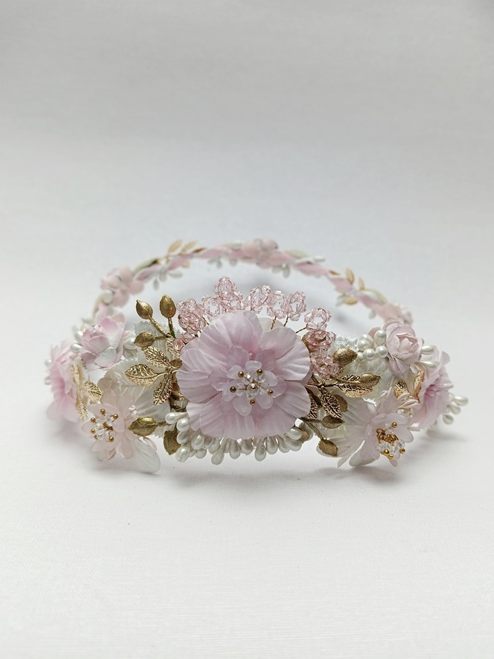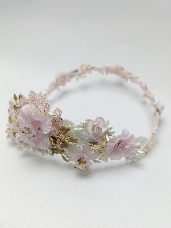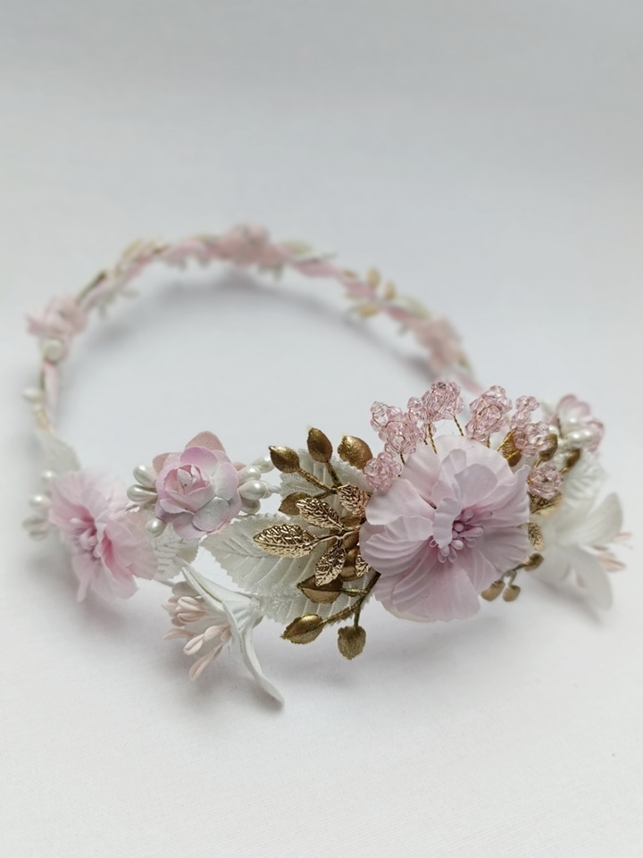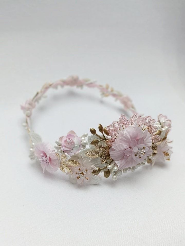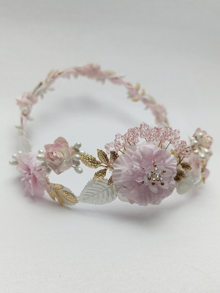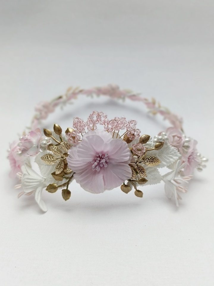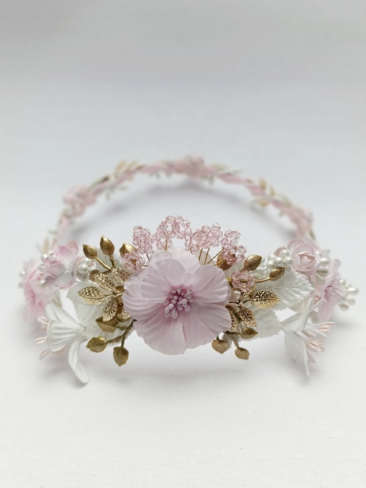 Esta corona destaca por su armoniosa combinación de tonos rosa claro y blanco, con una principal flor rosa en la parte posterior rodeada de flores más pequeñas de color blanco. Está adornada con detalles dorados, pistilos cristalizados rosa y hojas blancas. Su estructura es ligera y flexible, lo que permite ajustarla cómodamente a la cabeza de la niña.