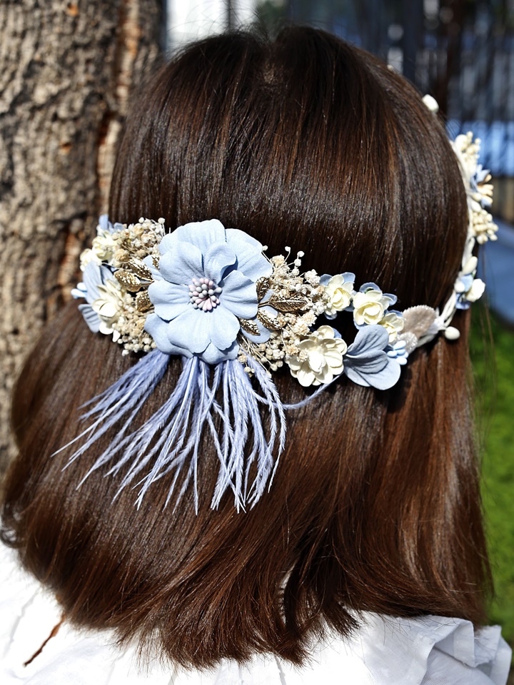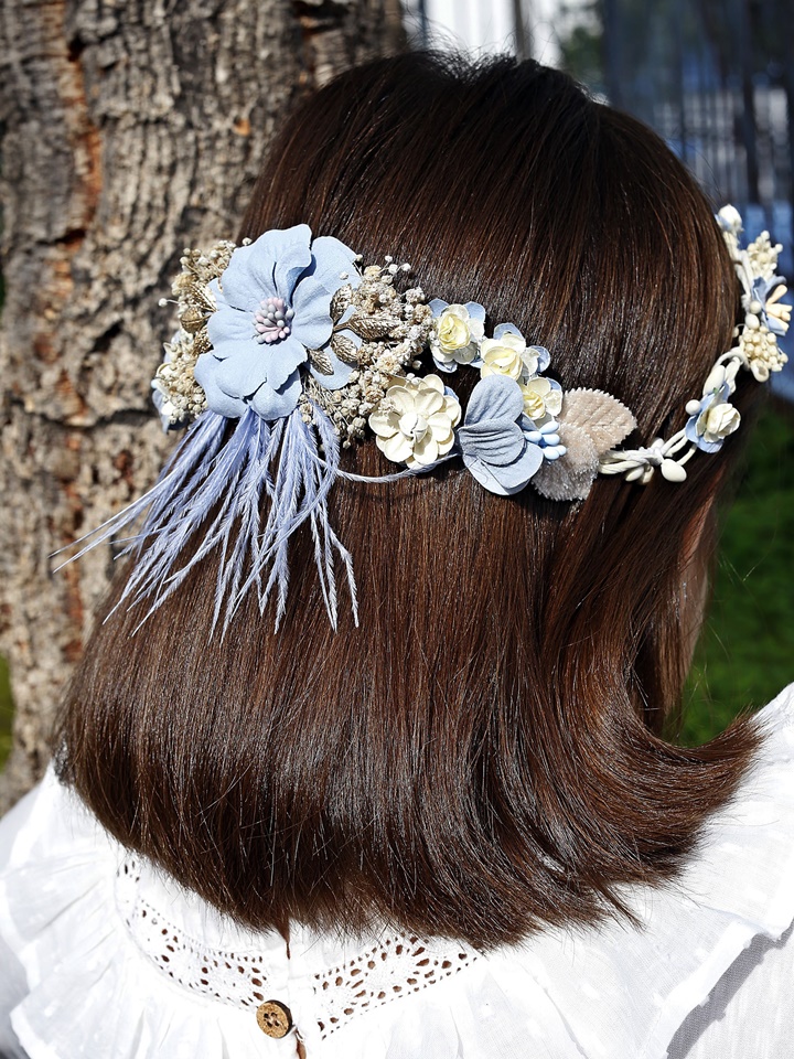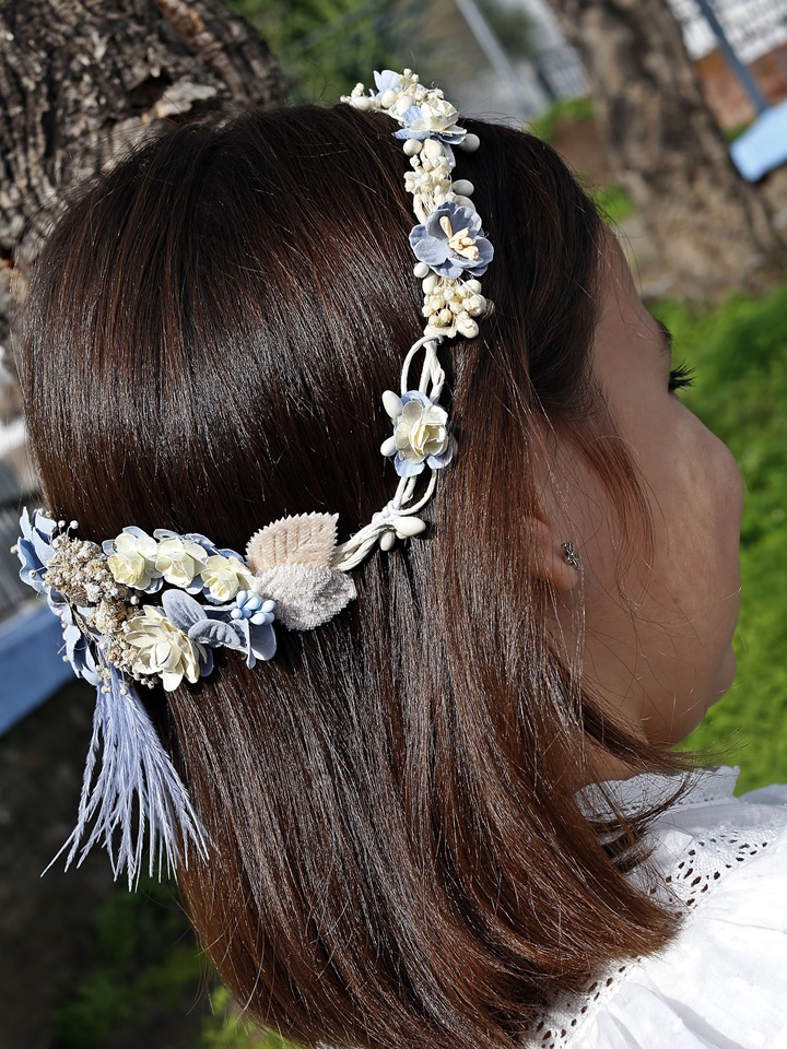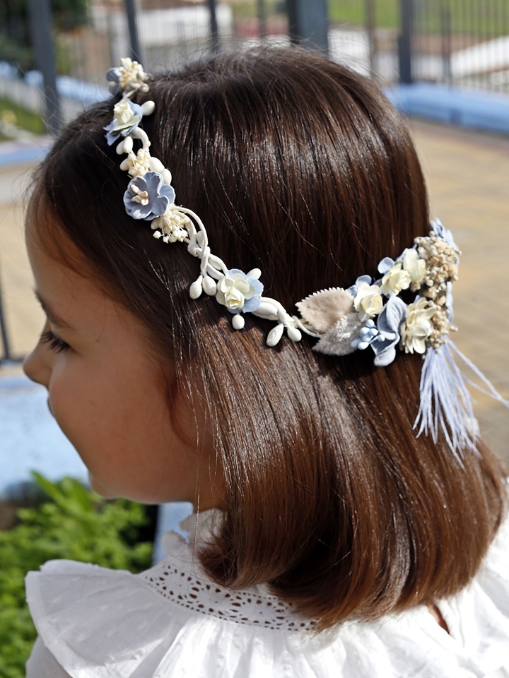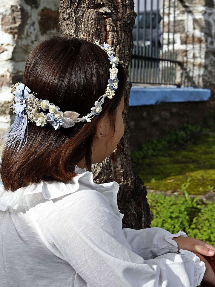 Corona de comunión Santander concretamente, está elaborada con flores en tonos azul pastel y blanco, combinadas con pequeños detalles de flores beige. Incluye hojas decorativas en tonos dorados que aportan un toque elegante. Además, destaca por tener plumas finas en azul claro que añaden movimiento y originalidad al diseño. Cada elemento está cuidadosamente colocado para lograr una composición armoniosa y sofisticada.