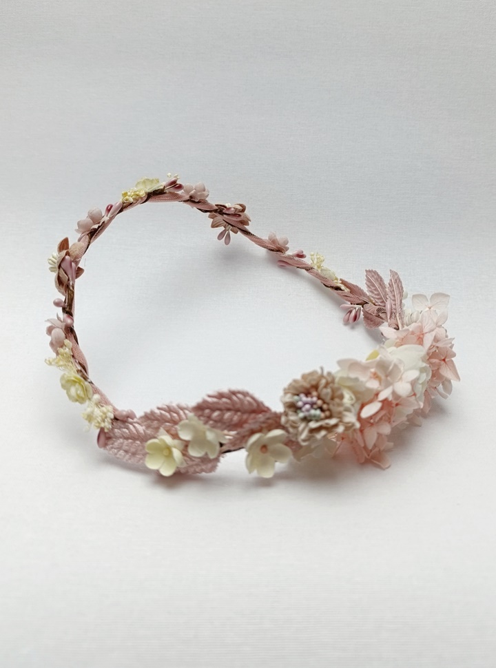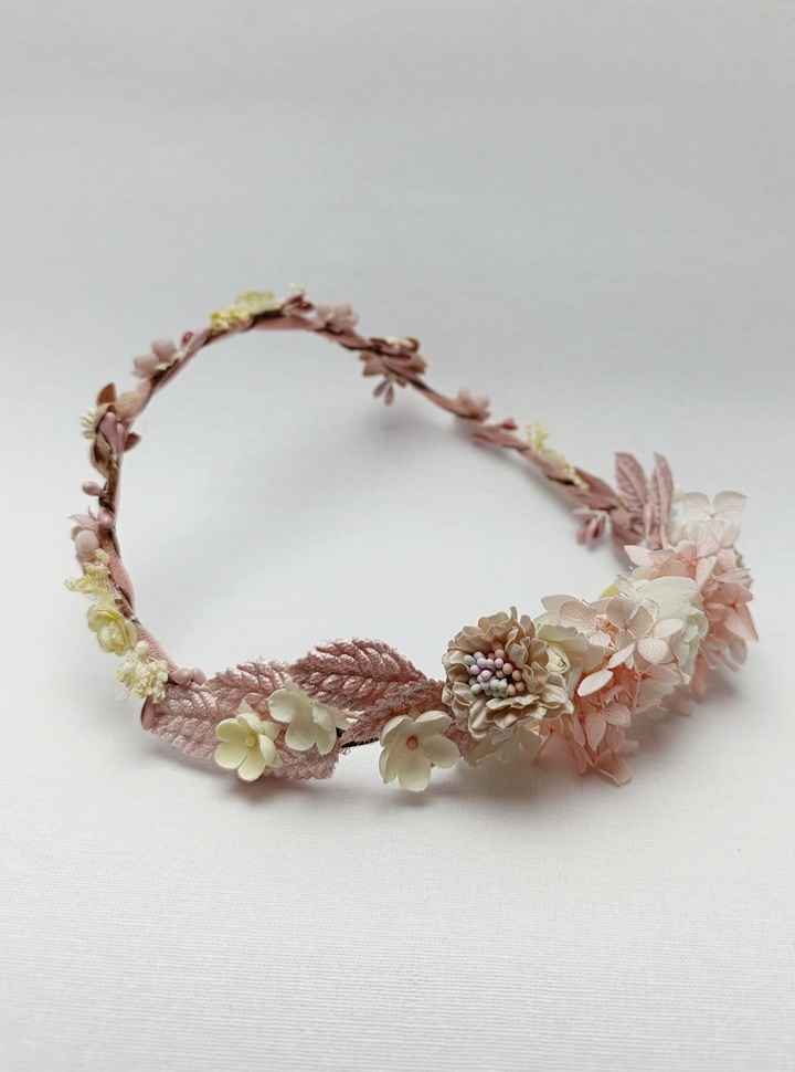 Corona de comunión Sofía concretamente contiene en la parte posterior se puede observar un entramado de flores preservadas beige y rosa, acabando con delicadas hojas de antelina rosa para dar un acabado elegante.